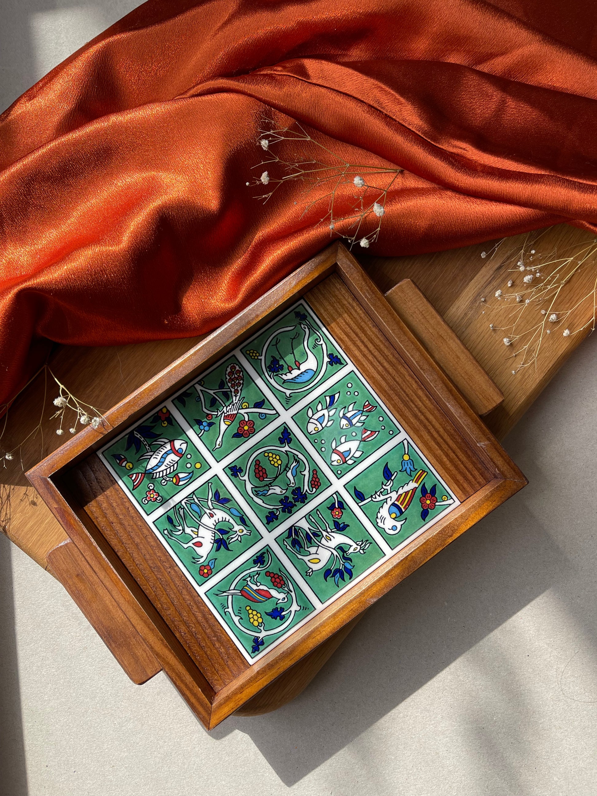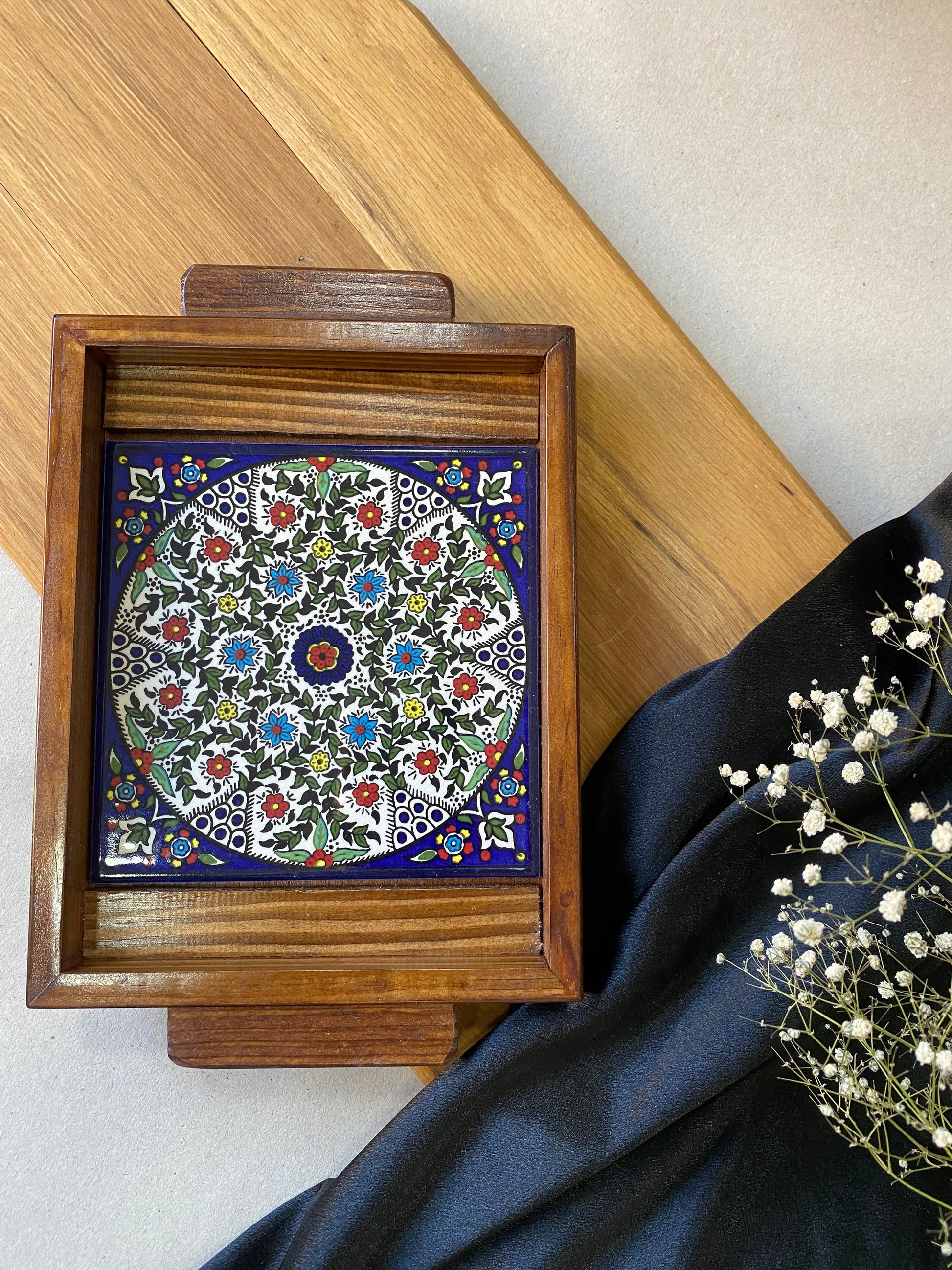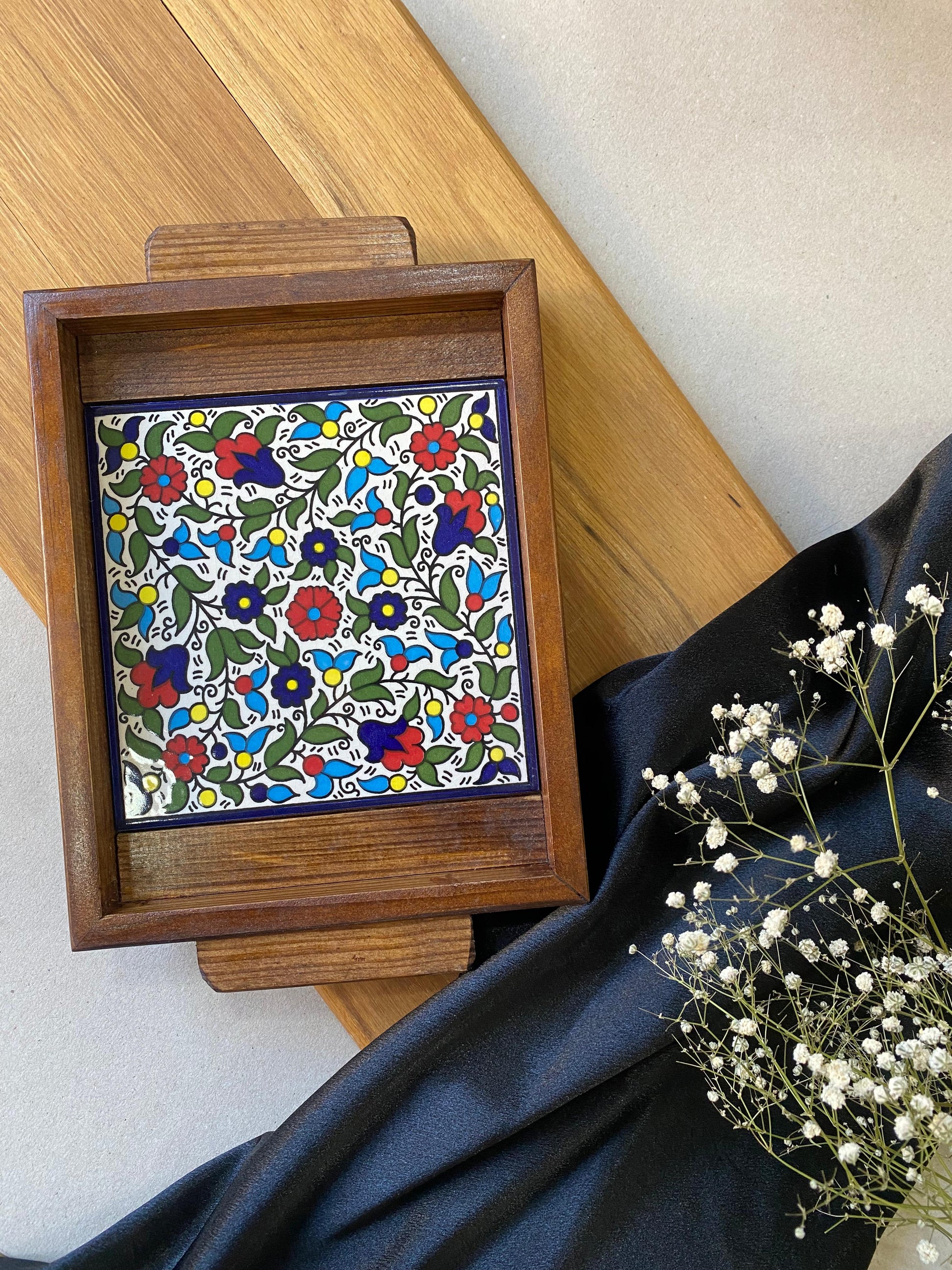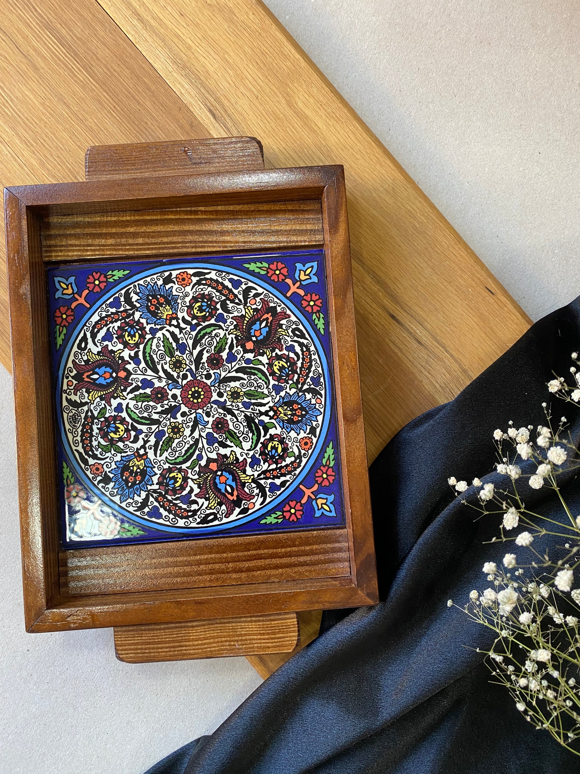 Beautiful wooden tray with a base hand-painted tiles.