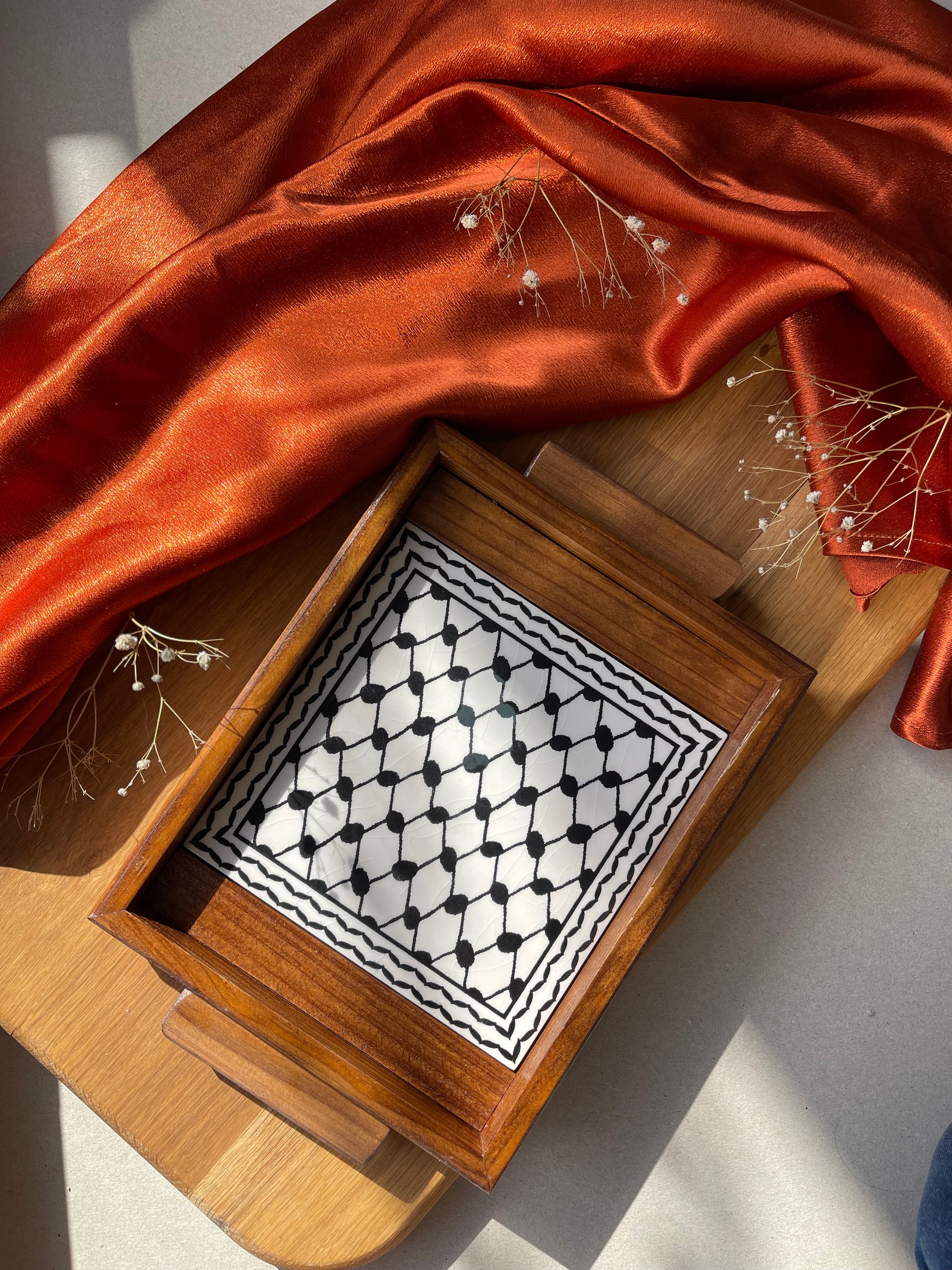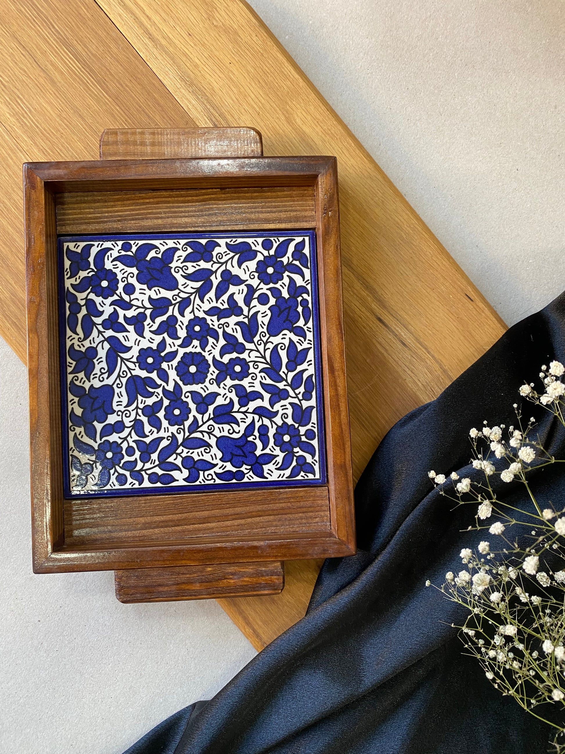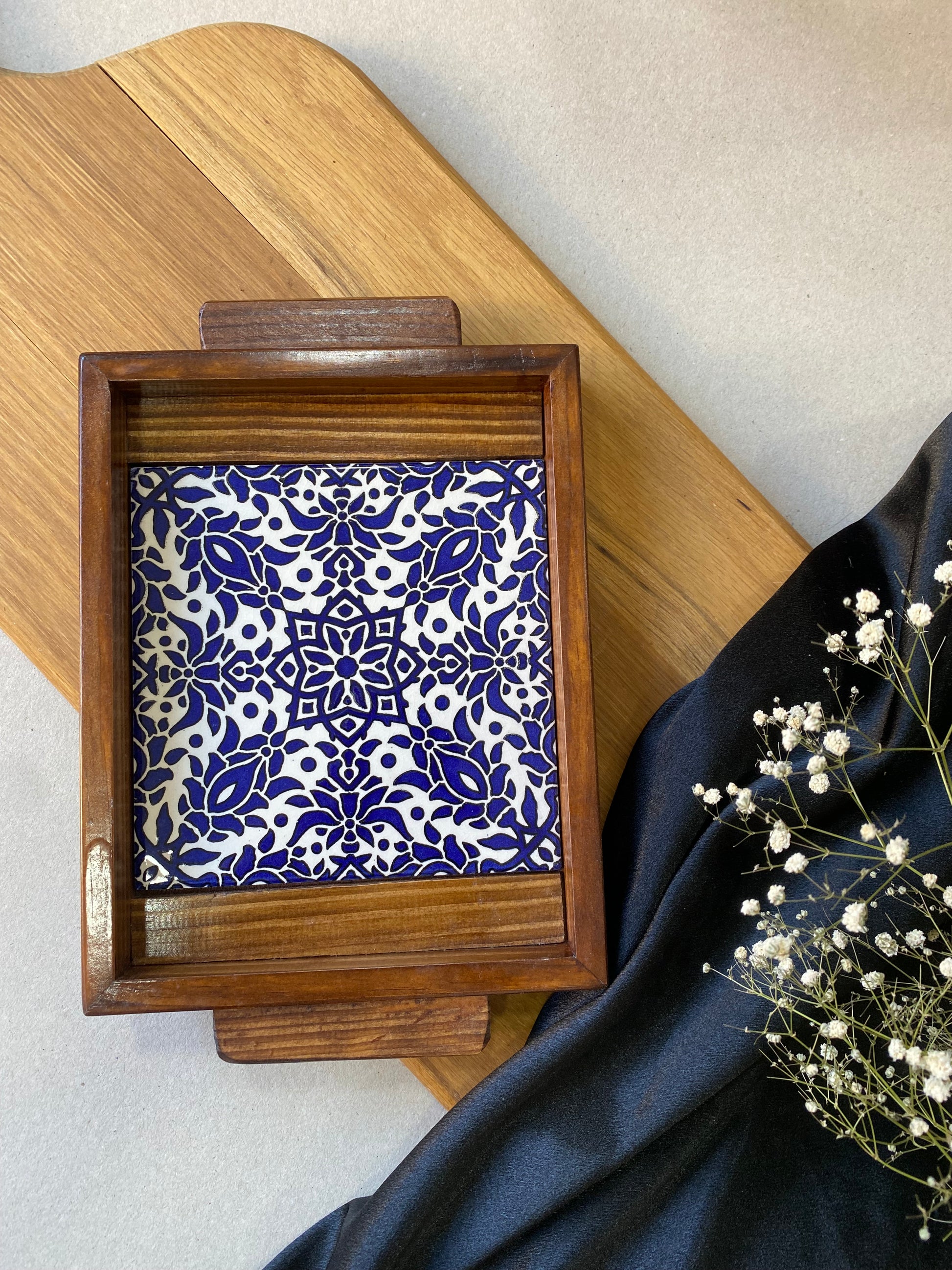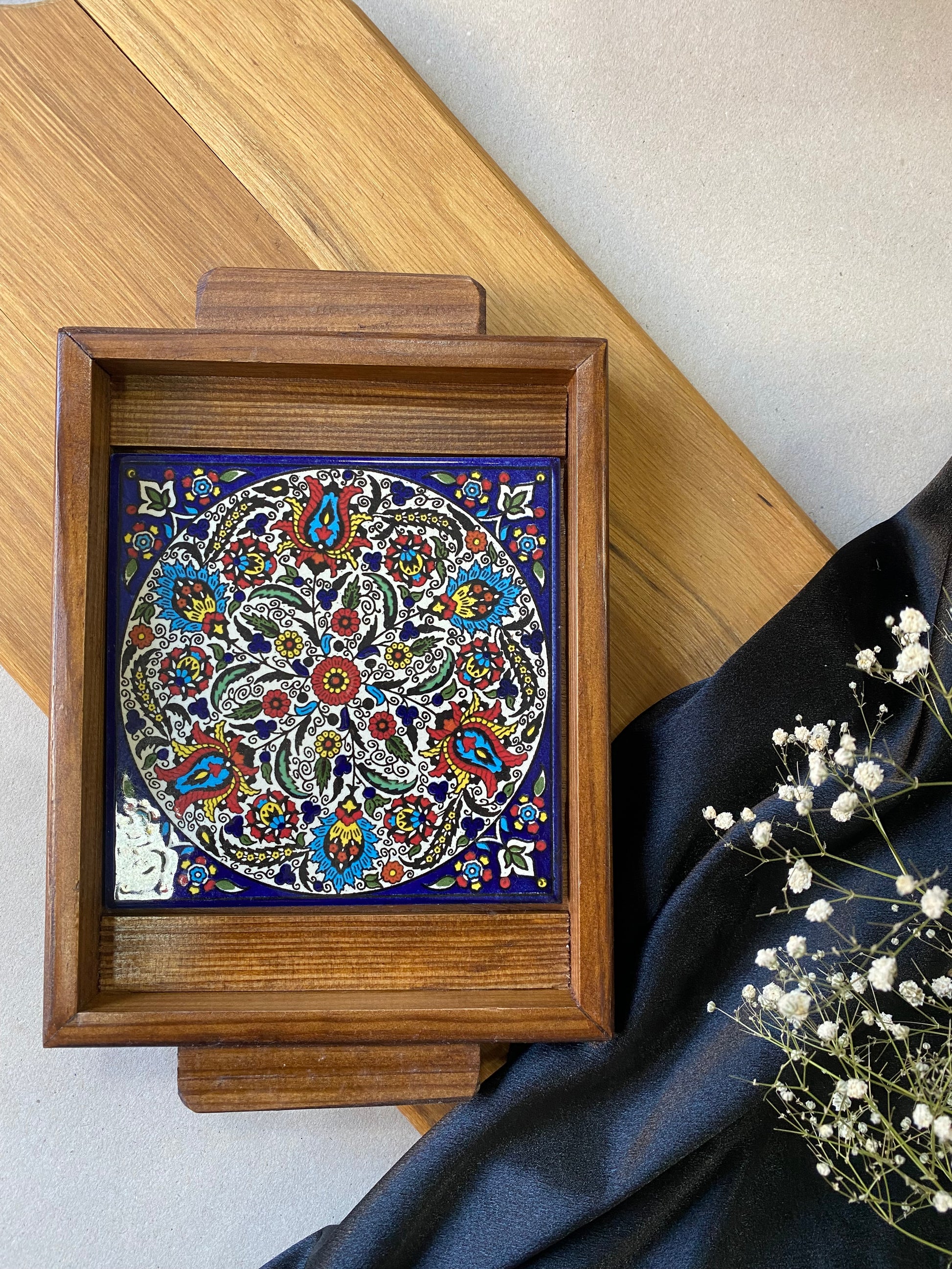 Beautiful wooden tray with a base hand-painted tiles.