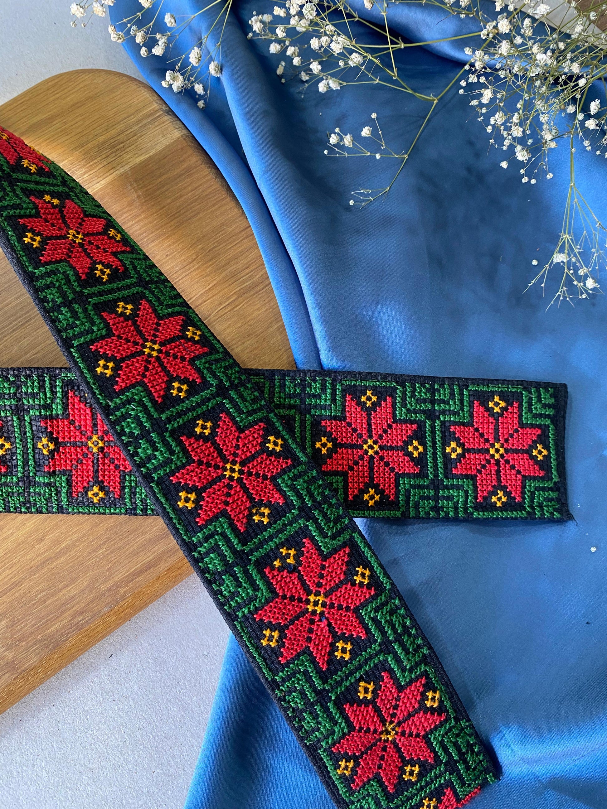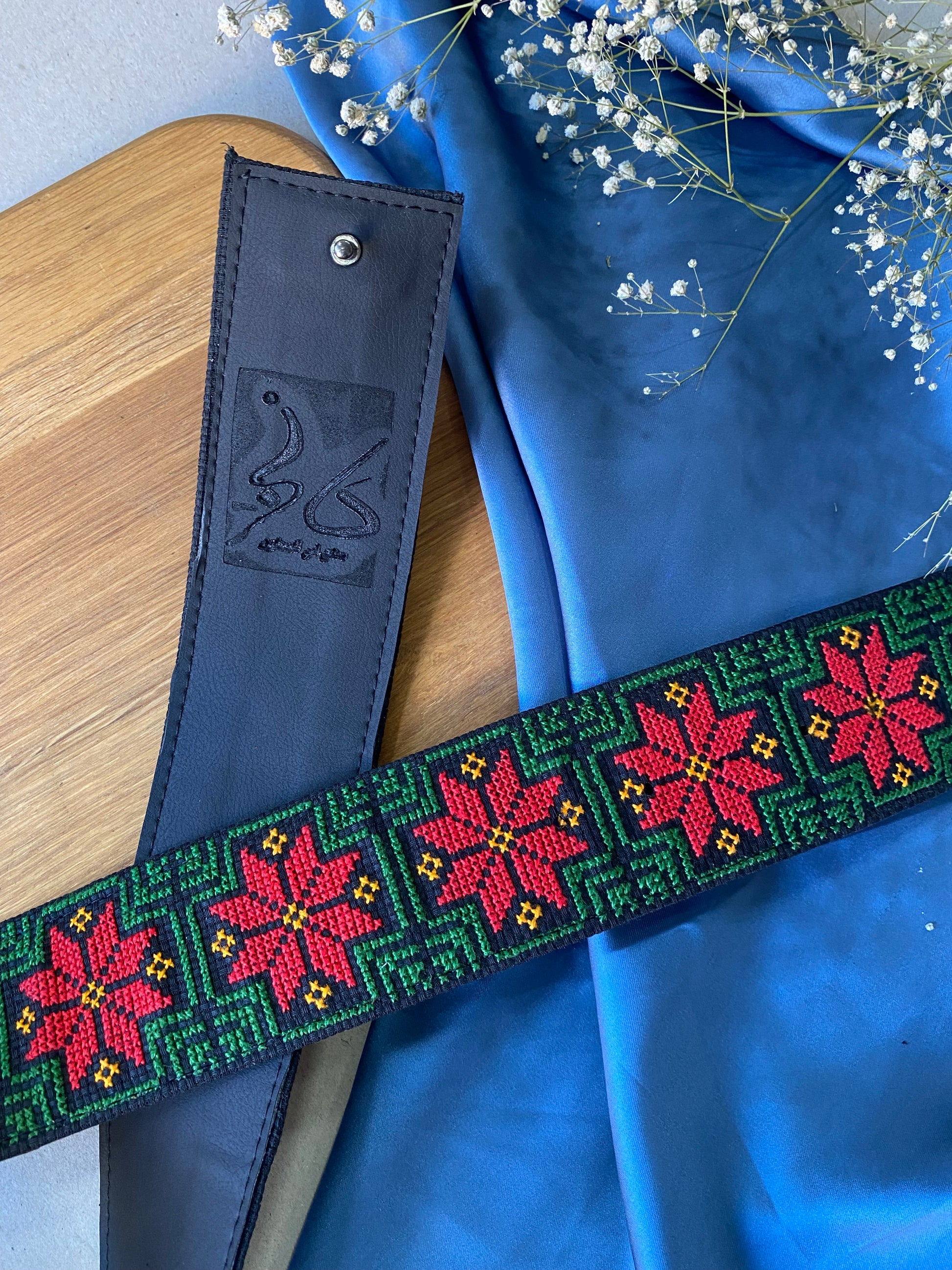 Discover our premium leather belt featuring exquisite Palestinian embroidery. Crafted from high-quality leather, it combines durability with vibrant, hand-embroidered designs that reflect rich cultural heritage. Perfect for adding a touch of sophistication and unique artistry to any outfit. A stylish and meaningful accessory for any wardrobe.