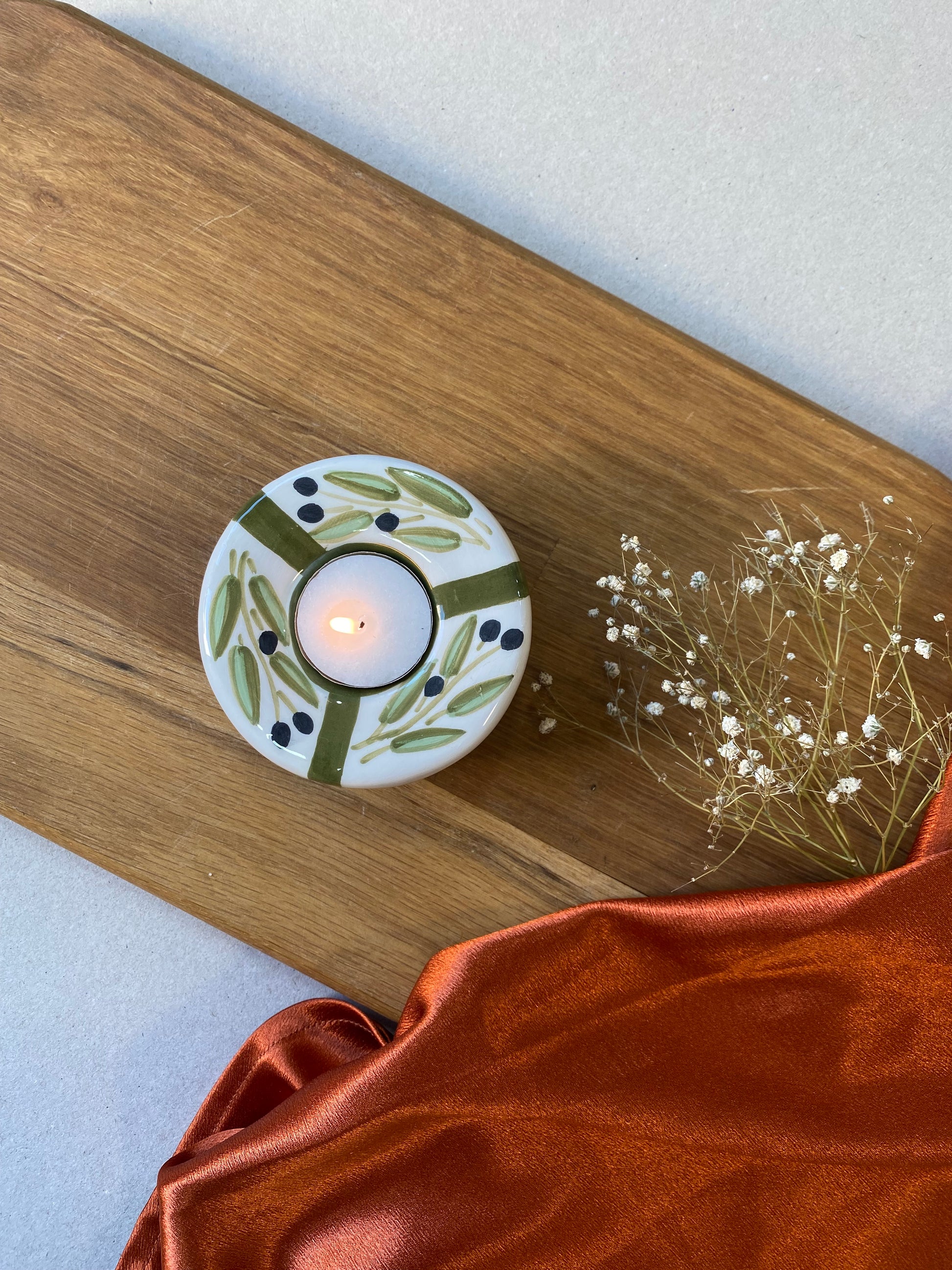A charming ceramic tealight holder adorned with olive branch motifs. Ideal for creating a warm ambiance in your kitchen or dining area,living room.