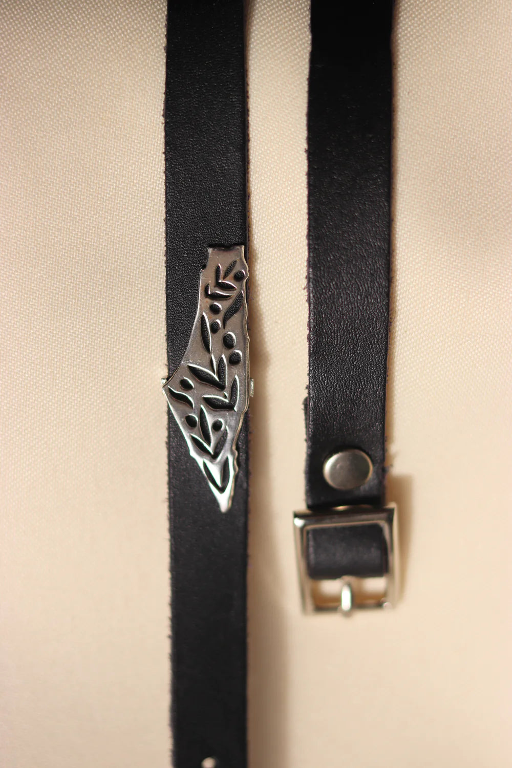 Palestine map with olive leaves pattern engraved inside leather bracelet