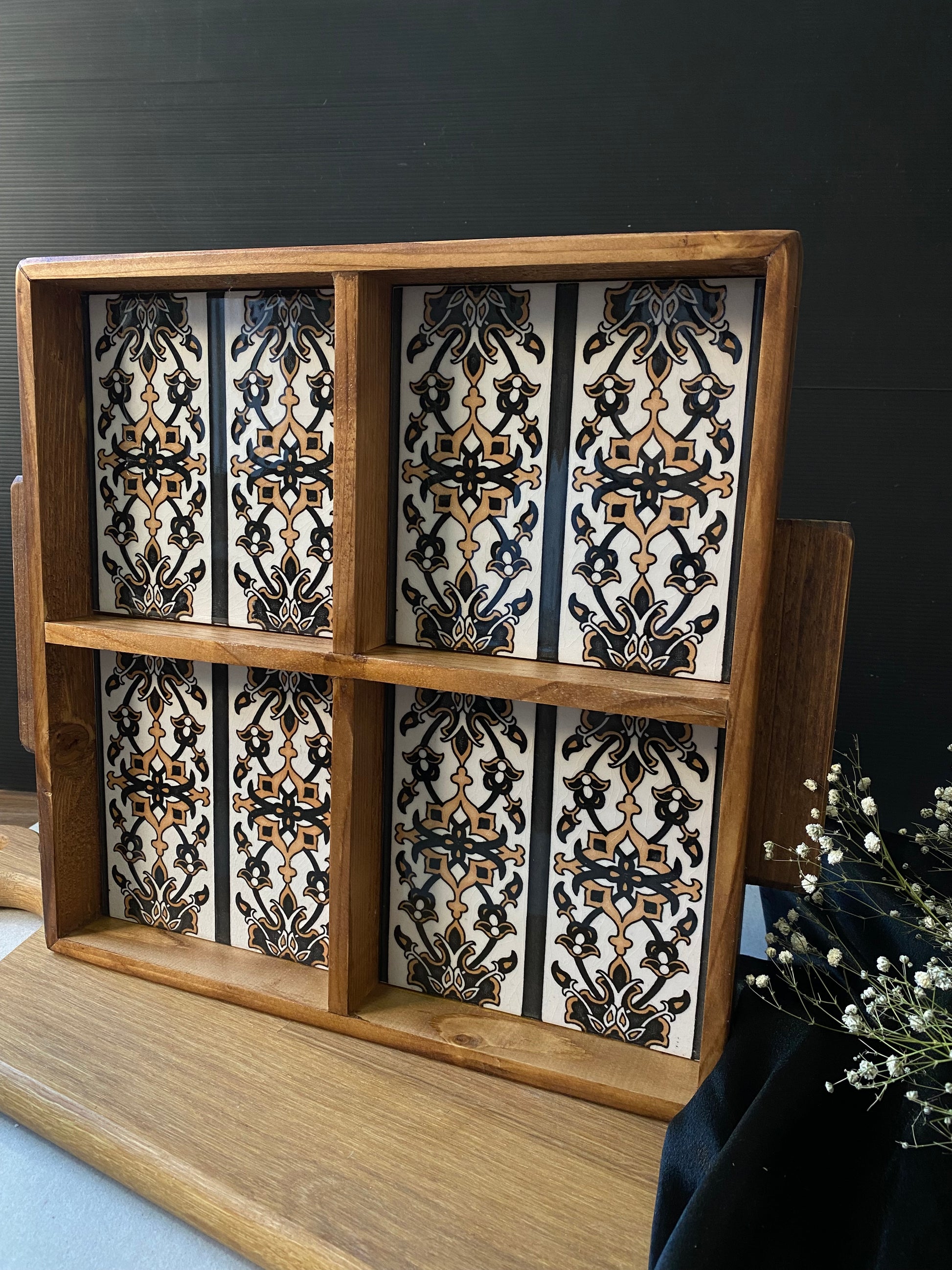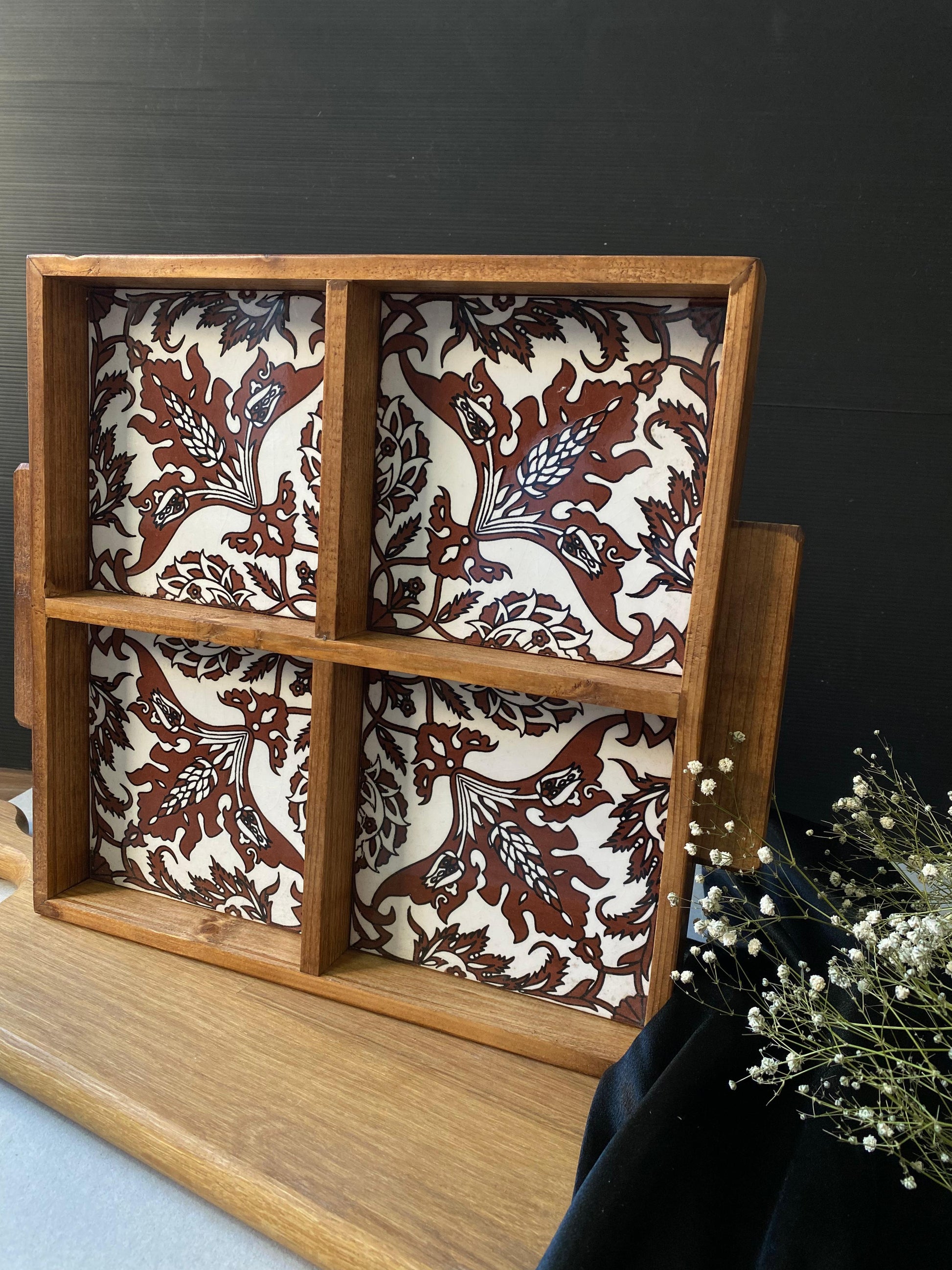Beautiful wooden tray with a base of Four divided hand-painted tiles.
