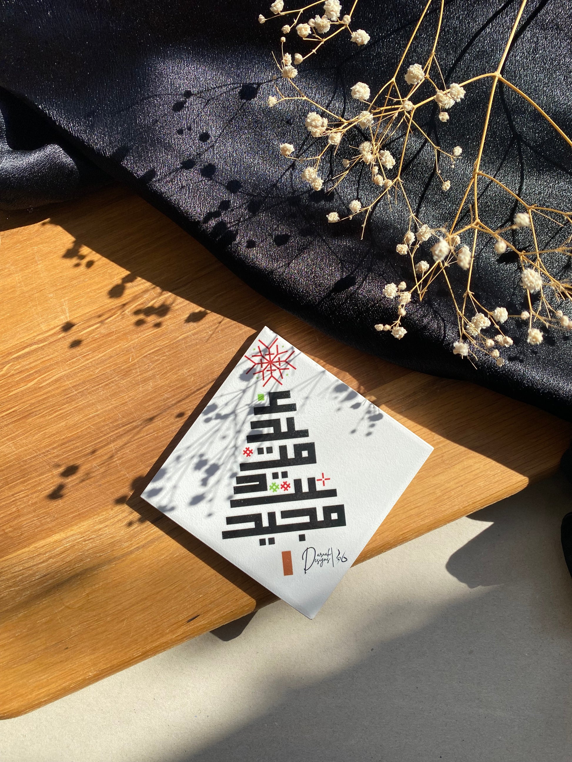 Celebrate the season with our festive framed tile coasters, designed with Arabic calligraphy forming a Christmas tree shape, complemented by small colorful accents. Framed in light olive wood, these tiles make for charming holiday decor that blends tradition with modern design. Perfect as coasters or as wall decor, they are a delightful way to bring a touch of cultural heritage and holiday cheer into your space. These coasters also make thoughtful, unique gifts for friends and family.