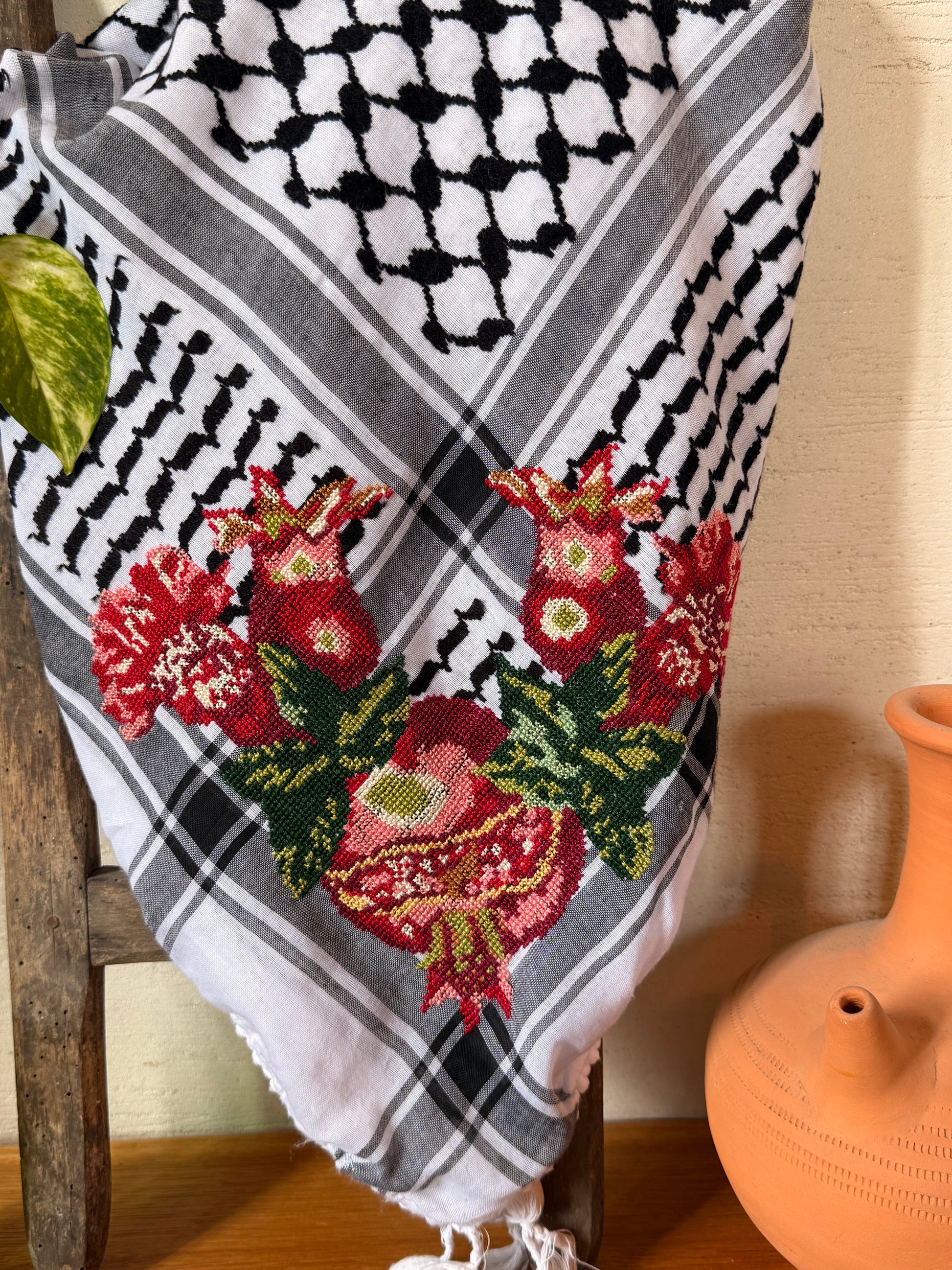 This unique keffiyeh features delicate hand-embroidered Palestinian Tatreez inspired by the traditional pomegranate motif. Carefully stitched by hand using authentic Palestinian cross-stitch techniques, the embroidery brings together the iconic keffiyeh pattern with one of the most meaningful symbols in Palestinian folk art.