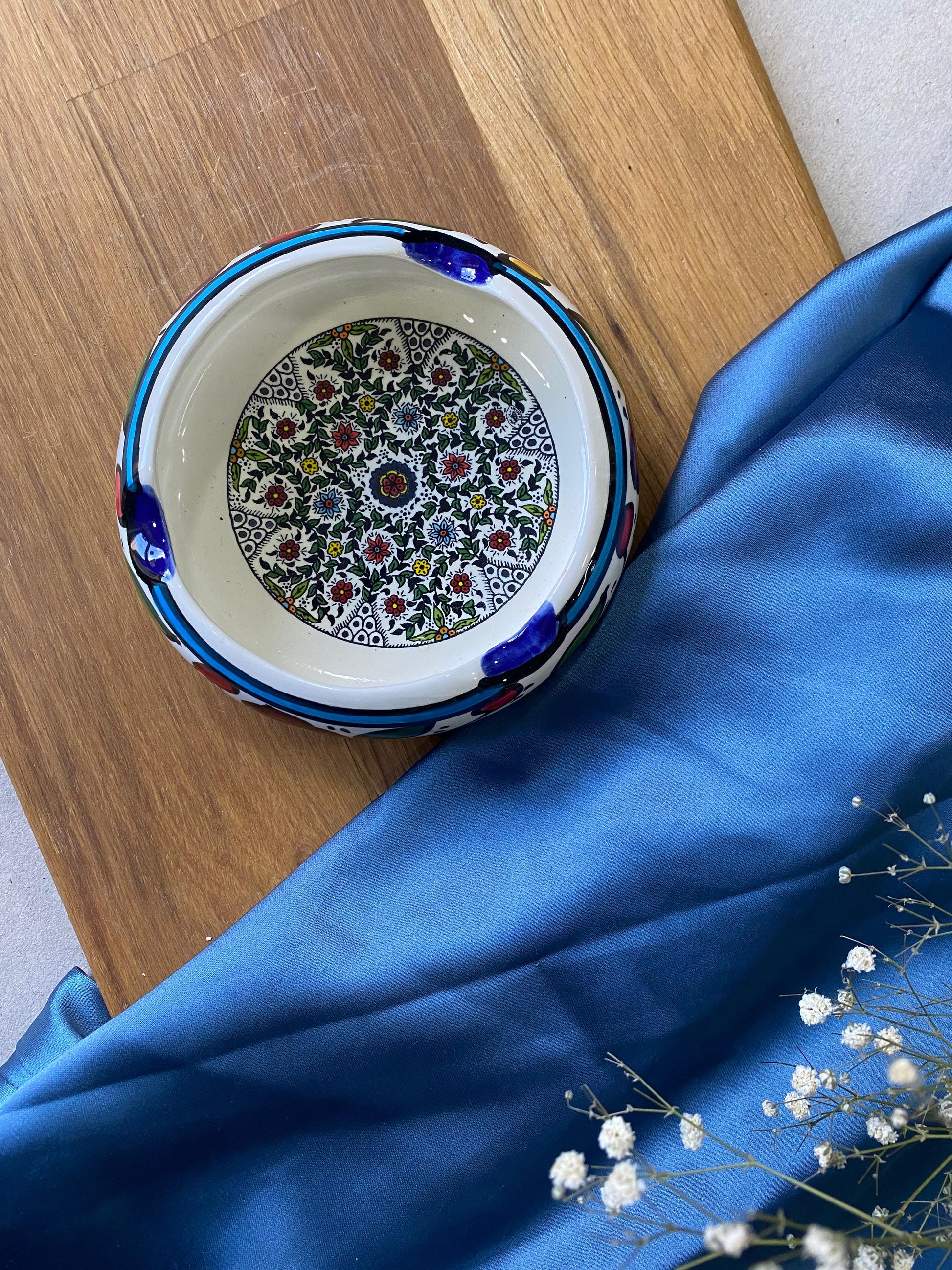 A handmade ashtray from Hebron, Palestine, is a unique piece that combines functional design with traditional artistry. Crafted from local materials, it often features intricate, hand-painted patterns that reflect Hebron's rich cultural heritage. Each ashtray is meticulously made by skilled artisans, offering both practicality and artistic beauty.
