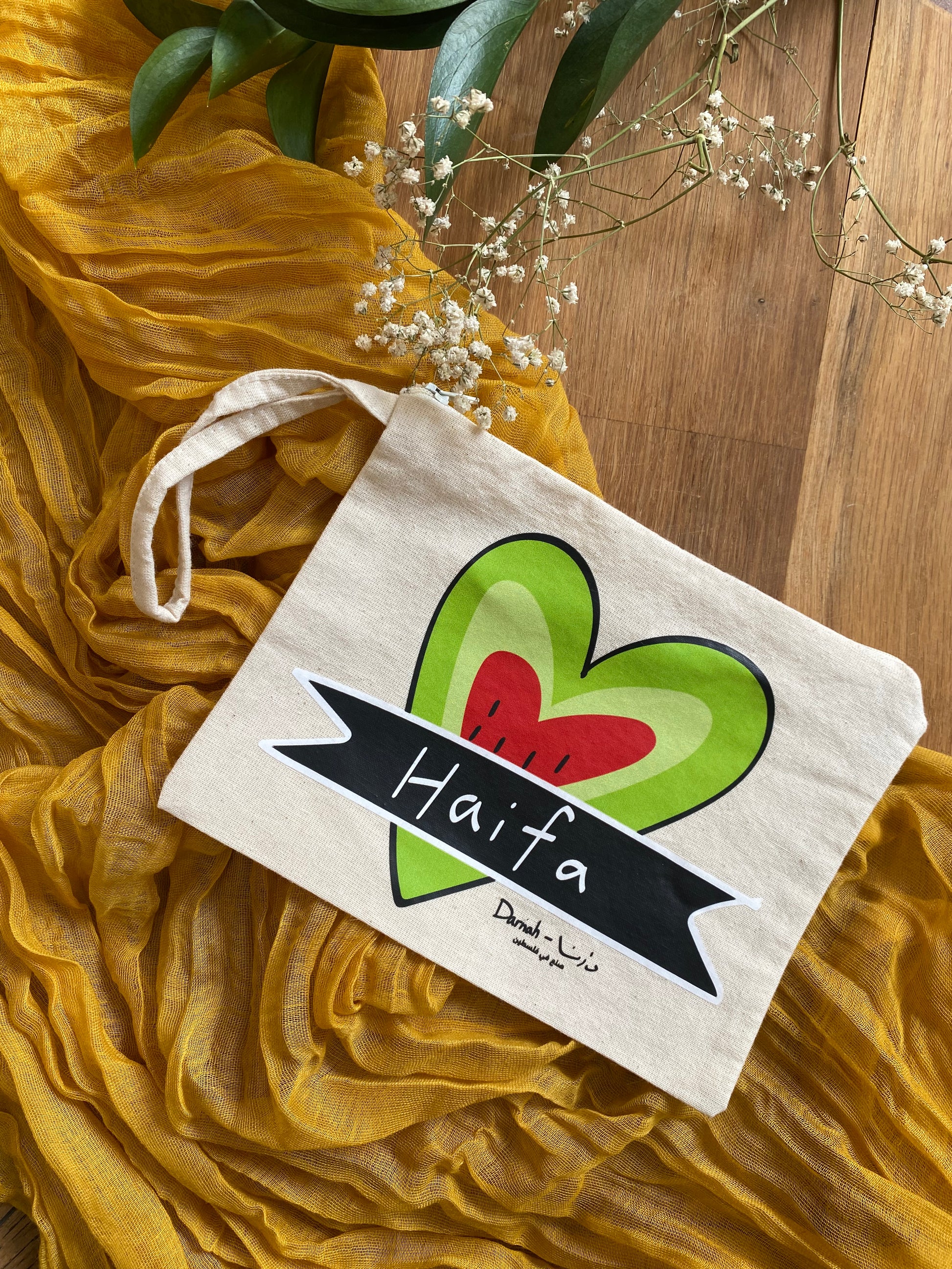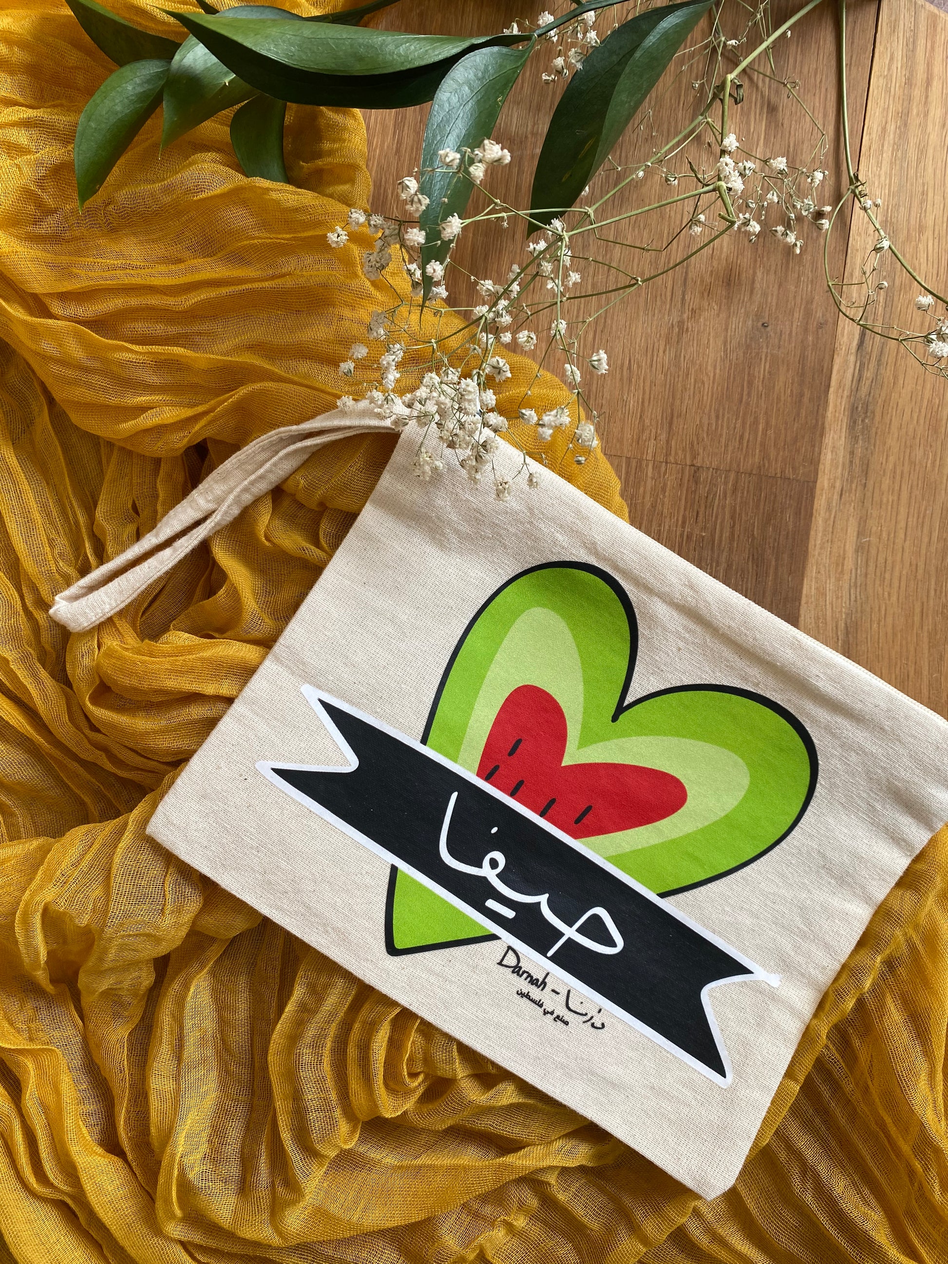 This pouch started as a sketch of Haifa’s spirit. The watermelon is a symbol of love and identity. The heart shape carries both playfulness and pride, turning an everyday accessory into a little piece of home.