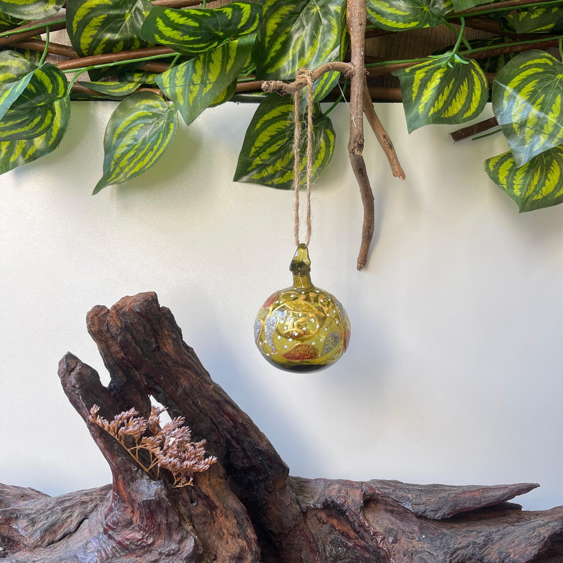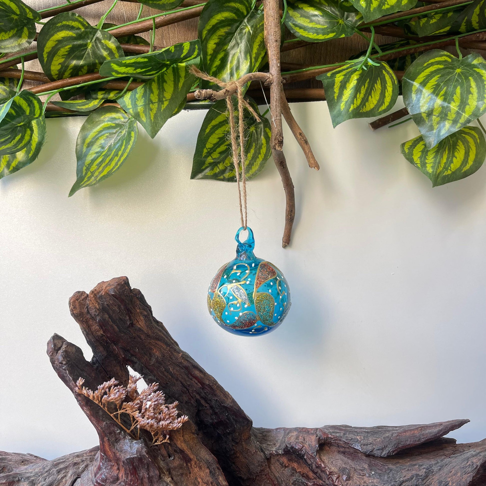 This handcrafted Hebron blown glass bauble is perfect for indoor and outdoor decor. Hebron glass is a centuries-old Palestinian craft, renowned for its vibrant colors and intricate designs. Hand-blown by skilled artisans in Hebron, each piece reflects a rich cultural heritage passed down through generations. Using recycled glass and traditional techniques, Hebron Glass is celebrated for its beauty and craftsmanship, offering a unique blend of artistry and sustainability. From decorative vases to everyday glassware, these handmade items embody the spirit of Palestinian resilience and creativity.