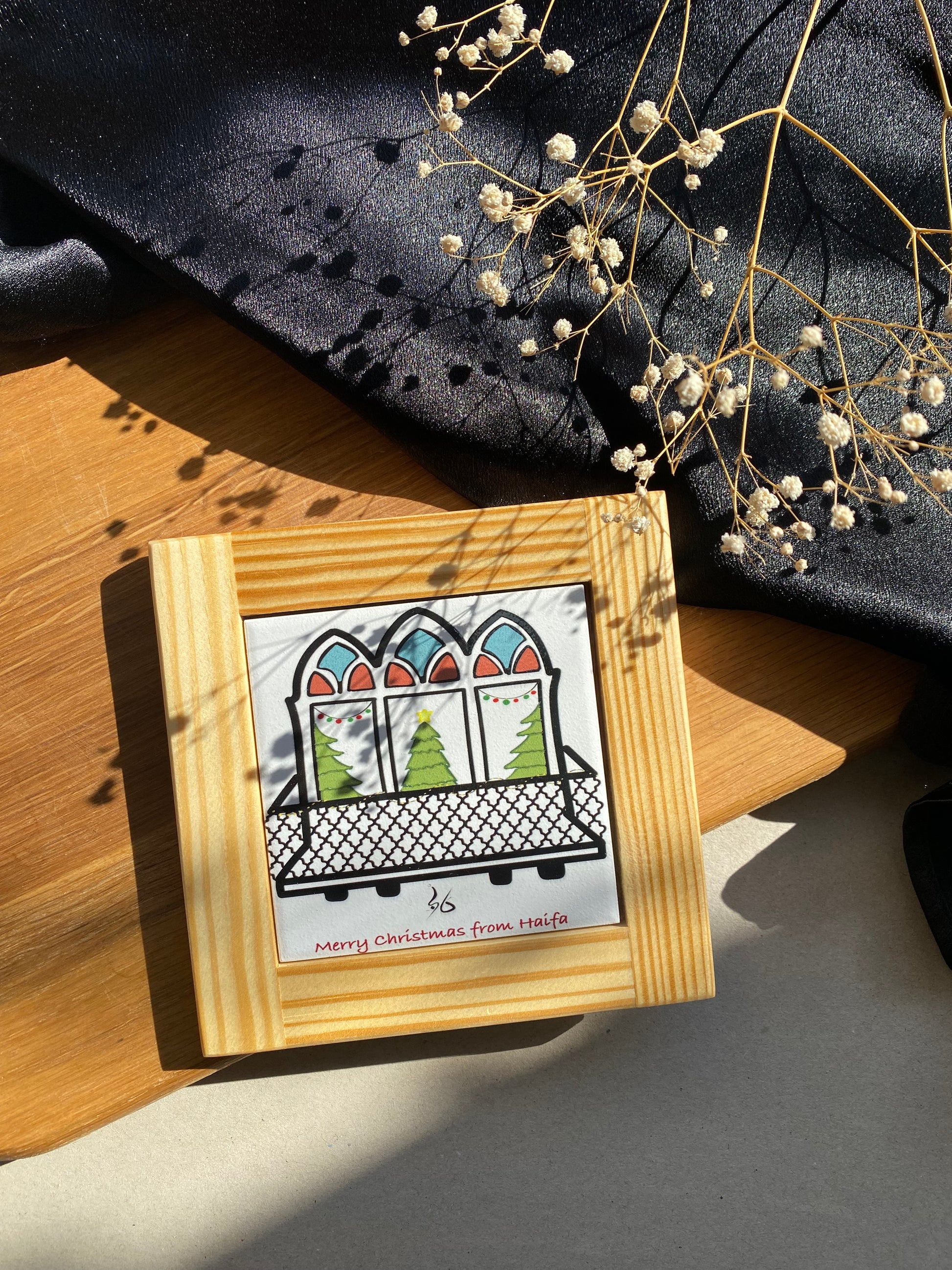 Bring the charm of Haifa into your holiday decor with our 'Merry Christmas from Haifa' ceramic design. This unique artwork depicts a traditional veranda with arched windows, adorned with festive Christmas trees and lights, blending the warmth of the holiday season with the elegance of Palestinian architecture. Ideal as a holiday decoration or a heartfelt gift, this piece captures the spirit of Christmas from the historic city of Haifa, inviting a touch of Palestinian heritage into the festivities.