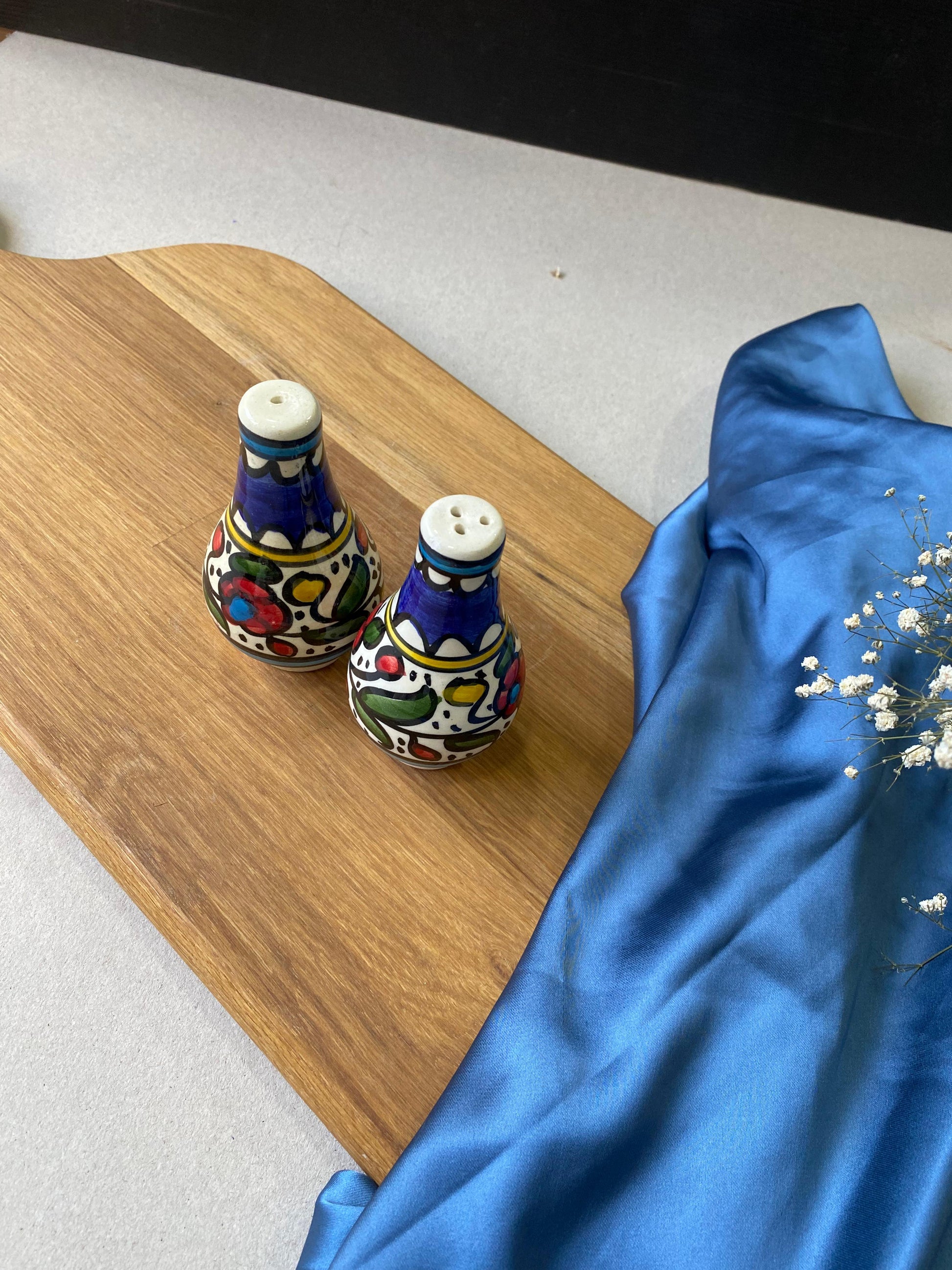 Handmade salt and pepper shakers from Hebron, Palestine, are beautifully crafted items that highlight local artistry. Made from clay and often hand-painted with intricate patterns, these shakers are functional and decorative. Each piece reflects Hebron's rich cultural heritage and traditional craftsmanship.