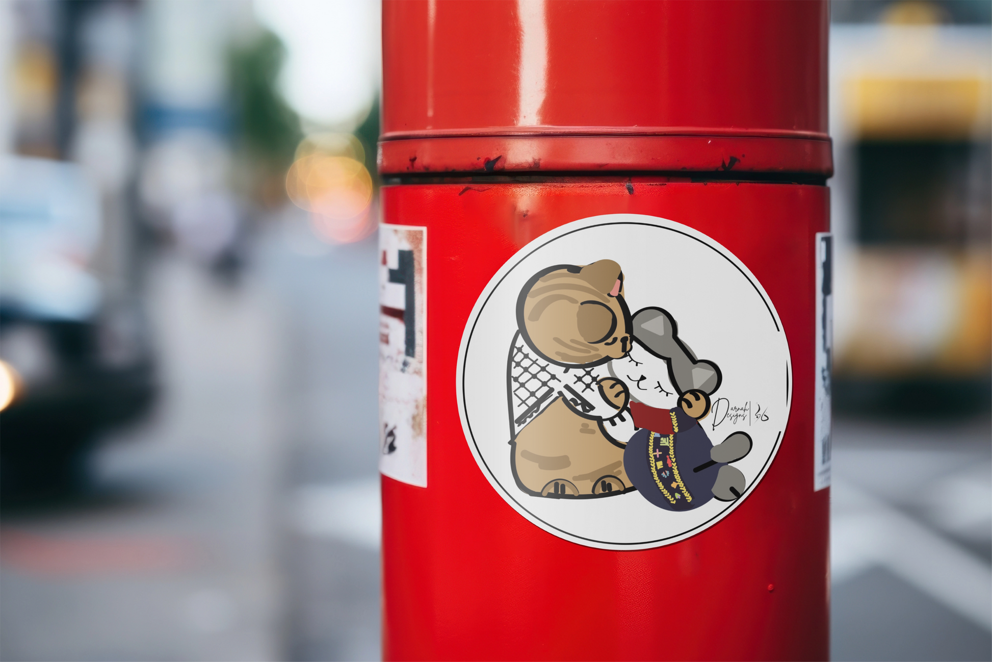 This design by Luris Khoury brings a playful, heartfelt twist to a timeless image, weaving it with symbols of Palestinian heritage and tenderness.