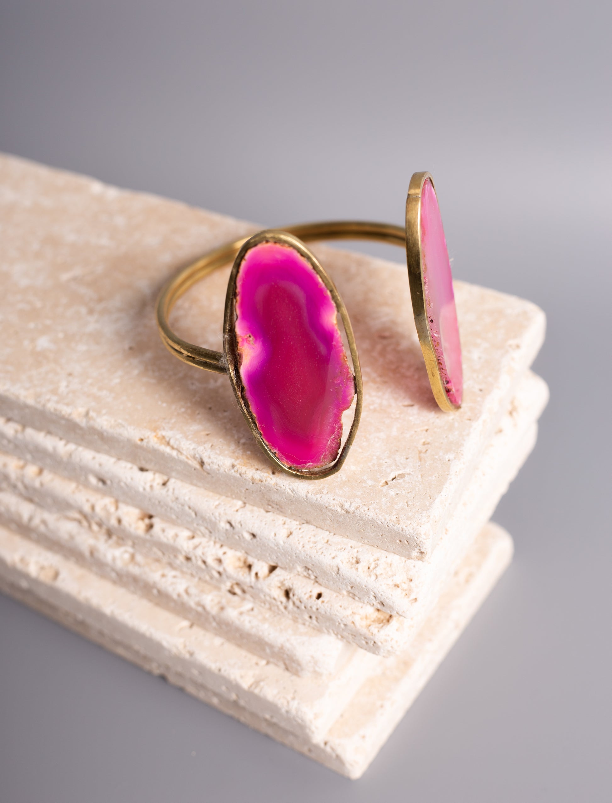 اسوارة حجرين اجات (Two Agate Stones Bracelet) is a beautifully designed piece that features two polished agate stones, each chosen for its unique color and natural beauty. The bracelet highlights the harmonious contrast between the stones, framed elegantly with high-quality brass and elegantly plated with 18-karat gold, that complements the agate's earthy tones. Known for its grounding and calming properties, agate adds a sense of balance and serenity to this elegant piece. The bracelet embodies simplicity and sophistication, making it a versatile accessory for any occasion.